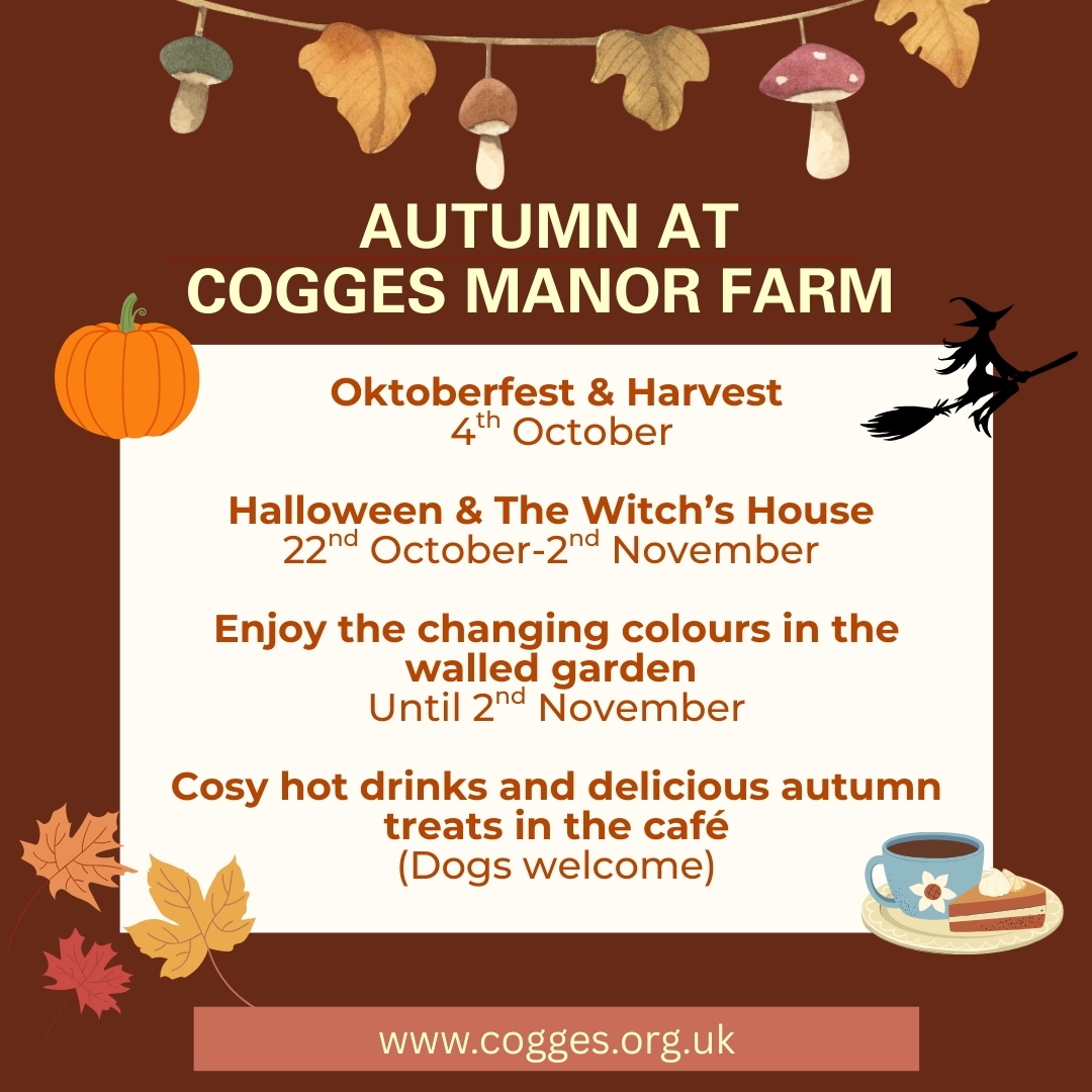 26 September 2025 Enjoy Autumn at Cogges Manor Farm Autumn is a wonderful time to visit Cogges Manor Farm. The walled garden is bursting with rich colours, the orchard is full of wonderful apples, many of them rare varieties that are no longer readily seen in England. Come along for a stroll around the grounds and sink into the tranquility and beauty of the season here and learn about one thousand years of history at Cogges. It's hard to believe you are just a stone's throw from the bustling market town of Witney, it really does feel like another world.Finish off your visit with a warm drink and a tasty autumnal treat in our Cogges Kitchen Café. We're family friendly and dog friendly too.EventsWe've got 2 events to enjoy this season:Oktoberfest on 4th October is a family-friendly celebration of October and Harvest with our barns being transformed into a Bavarian Bierkeller, traditional Bavarian food on offer, live music, vintage steam engines, family entertainment and heritage craft. There's a big discount for Season Ticket holders but tickets must be bought in advance. The site will be closed for the day, open only Oktoberfest ticket holders. Full details and tickets available here: https://shop3.myonlinebooking.co.uk/cogges/sessions.aspx?tid=165Halloween and The Witch's House From 22nd October - 2nd November our Manor House magically transforms into the Witch's House and the whole site is bursting with fun things to do. We'll have a kids Halloween disco and bouncy castle in the barn along with craft activities, a ghost trail around the site and spooky treats in the café. Full details and tickets available here: https://www.cogges.org.uk/Event/witchs-house2025 Closing for the season We're open until 2nd November and then we close for the season, opening only for our Christmas market on 29th and 30th November and again for our Christmas at Cogges event at weekends across December. Our café remains open year round (closing on Christmas Day, Boxing Day and New Year's Day).